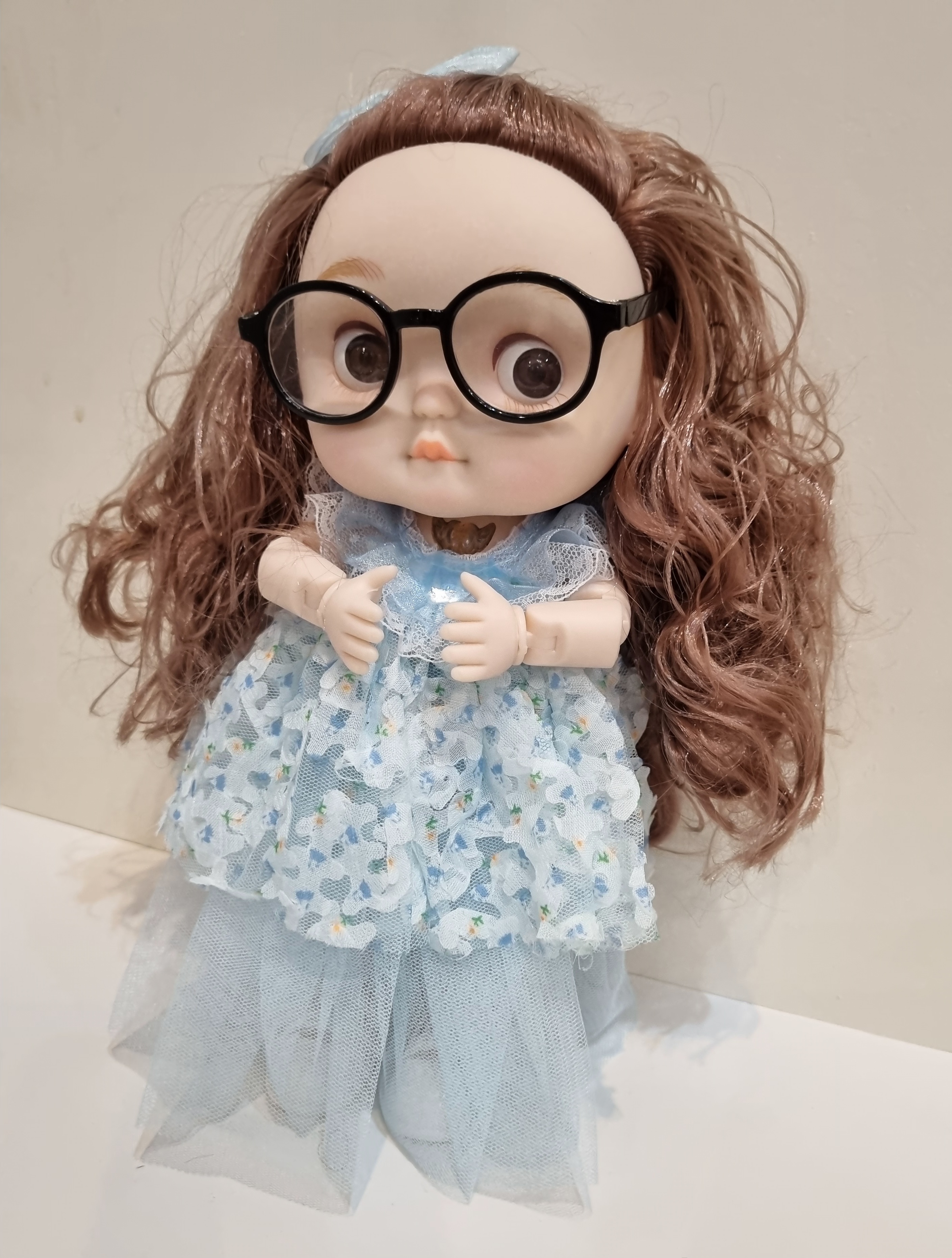 عروسک کره ای موزیکال عینک دار با لباس آبی