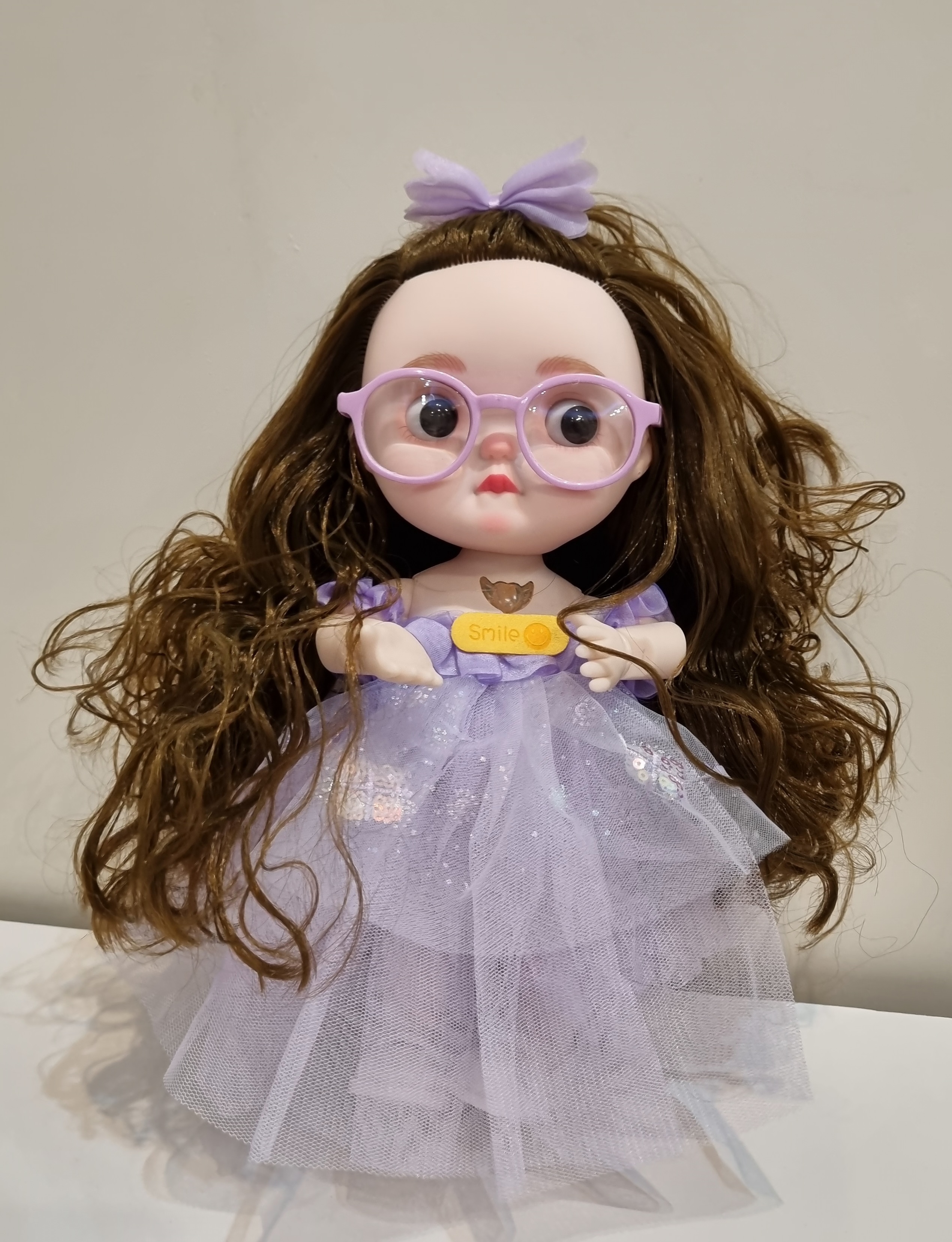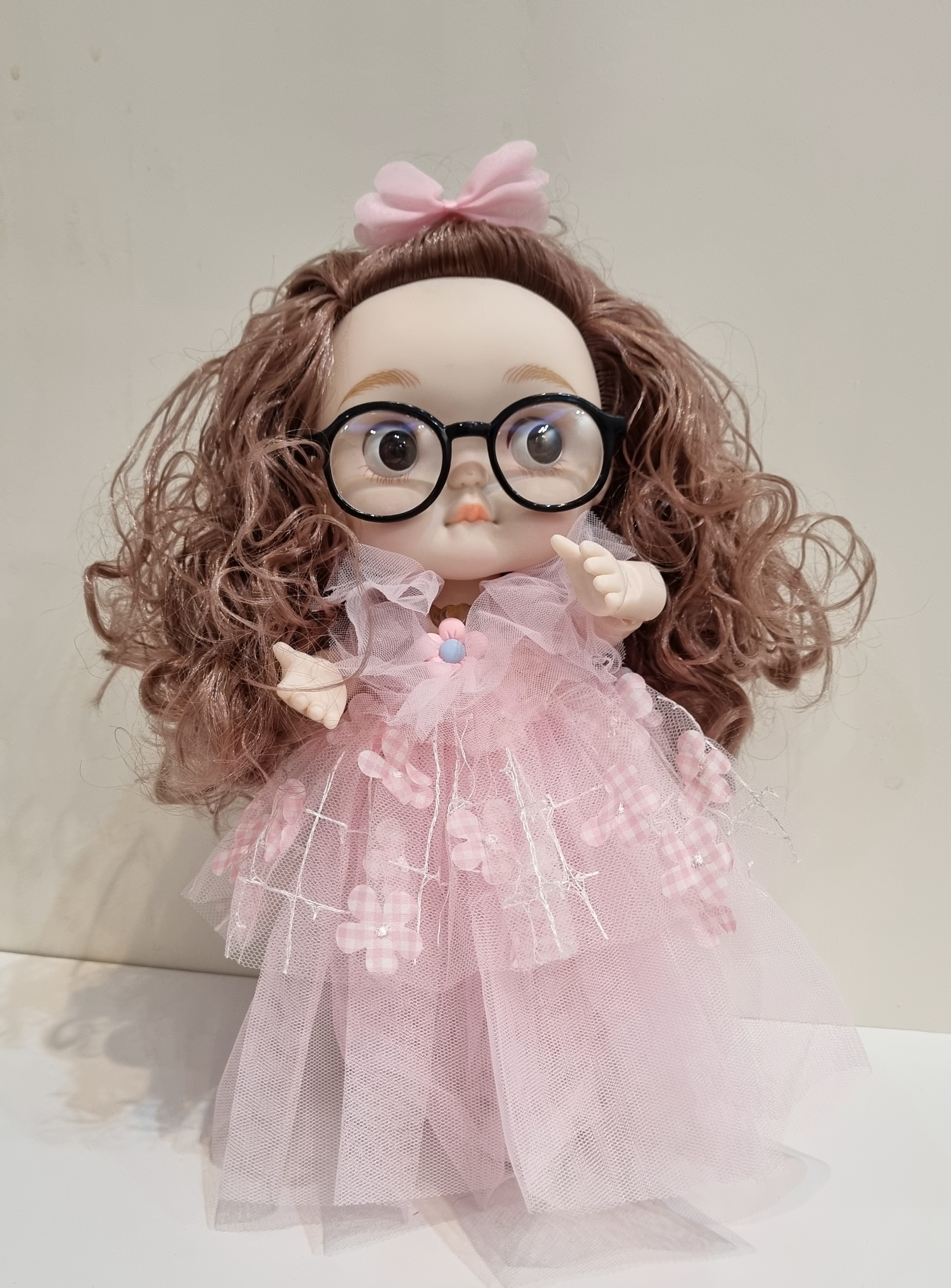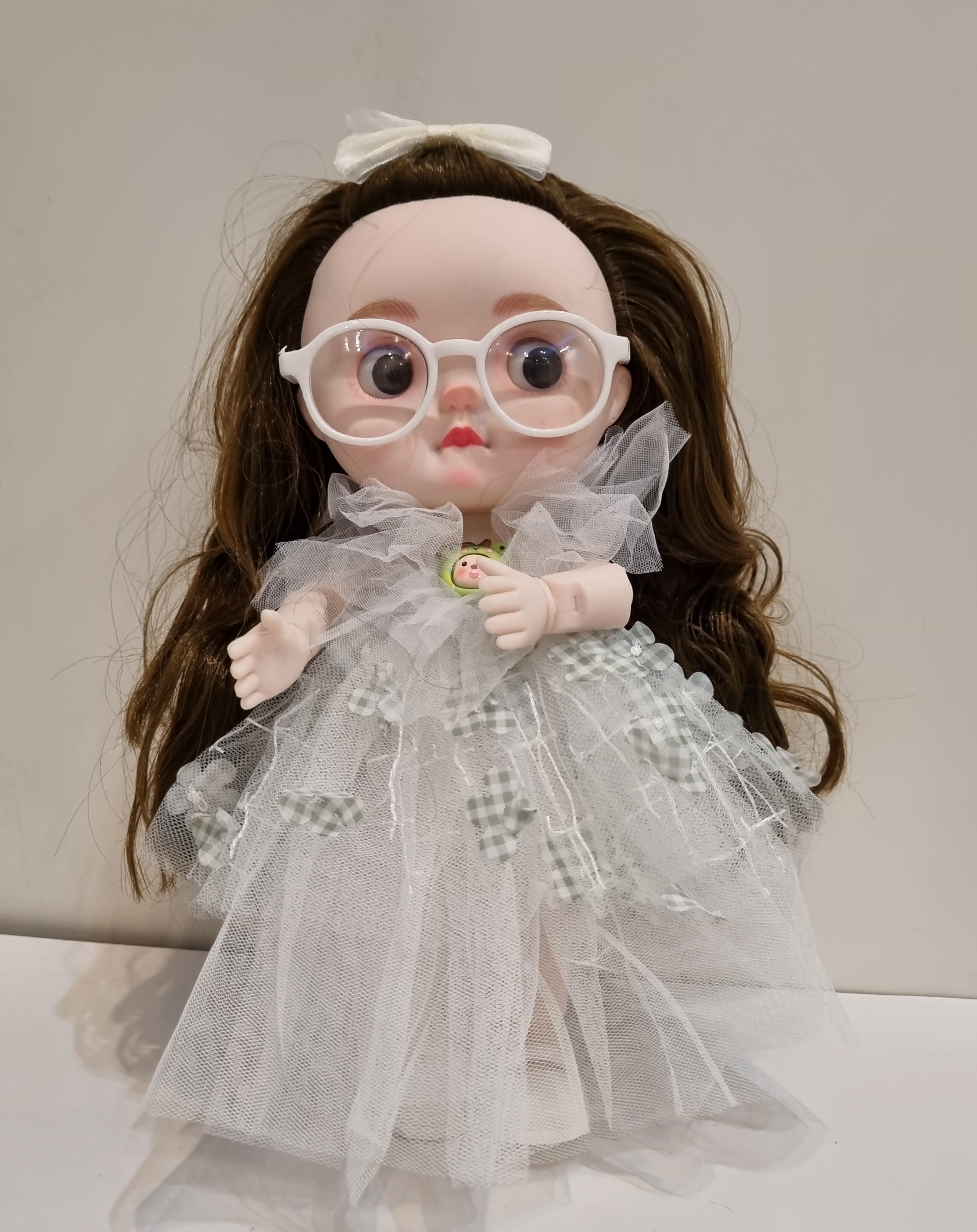 عروسک کره ای موزیکال با نمک عینک دار با لباس کرم