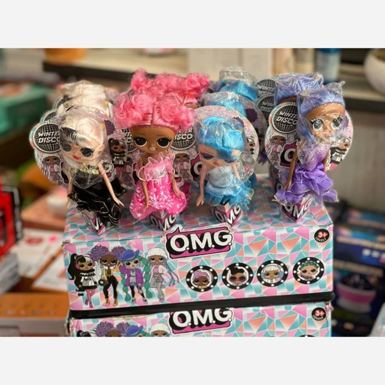 عروسکهای **الاوال قیفی (LOL OMG Cone)** از سری **Winter Disco** هستند. هر عروسک حدود **15 سانتیمتر** ارتفاع دارد و با لباسهای رنگارنگ (صورتی، آبی، بنفش و مشکی) و موهای پفدار عرضه میشود. بستهبندی آن به شکل **قیف شفاف** طراحی شده تا داخل آن دیده شود و ظاهری جذاب برای ویترین فروشگاه دارد. این محصول مناسب کودکان **3 سال به بالا** است.