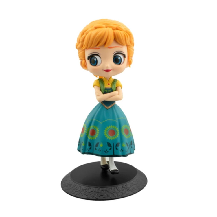 فیگور Qposket آنا از نسخه Frozen Fever محصول Banpresto با لباس سبز و دامن آفتابگردانی، ارتفاع 15 سانتیمتر، جنس PVC و پایه مشکی طرحدار؛ مناسب برای کلکسیون و دکور.