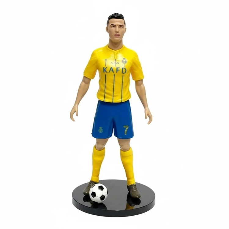 فیگور کریستیانو رونالدو با لباس باشگاه **النصر عربستان** طراحی شده و با ترکیب رنگ **زرد و آبی** جلوهی چشمگیری دارد. این مدل از جنس **PVC فشرده و بادوام** ساخته شده و حدود **20 سانتیمتر ارتفاع** دارد. شمارهی **7** و لوگوی باشگاه روی لباس بهدقت چاپ شدهاند و برای **کلکسیونداران، دکور رومیزی یا هدیه به هواداران رونالدو و النصر** انتخابی خاص و جذاب بهشمار میرود.