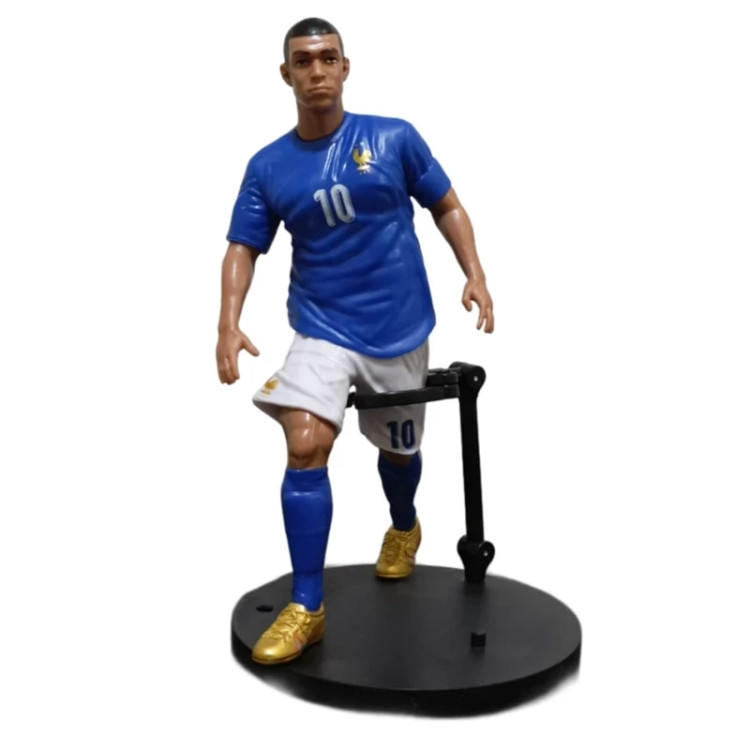 فیگور کیلیان امباپه – تیم ملی فرانسه مدلی دقیق و کلکسیونی از امباپه در لباس رسمی تیم ملی فرانسه، ساختهشده از PVC فشرده و مقاوم با کیفیت رنگ بالا. این فیگور با ارتفاع حدود 20 سانتیمتر طراحی شده و پیراهن آبی کلاسیک با شماره 10 و شورت سفید دارد که با جزئیات طلایی روی لوگو و کفشها جلوهای خاص یافته است. فیگور در حالت حرکت با توپ روی پایهی گرد مشکی با تکیهگاه نگهدارنده قرار گرفته است. طراحی پویای بدن، رنگآمیزی براق و جزئیات دقیق، این مدل را به گزینهای چشمنواز برای کلکسیونهای فوتبالی و دکور اسپرت ویترینها تبدیل میکند.