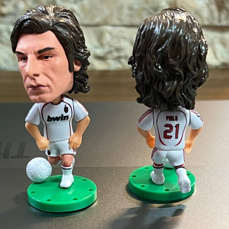 چاپ تمیز نام PIRLO و شماره در پشت لباس، جزئیات دقیق روی فرم مو، و توپ کوچک کنار پا باعث شده این مدل میان کلکسیونرها و طرفداران دوران طلایی میلان محبوب باشد.