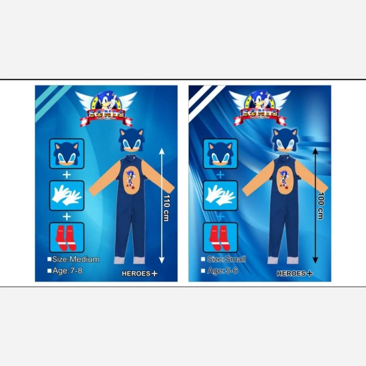 لباس سونیک شامل سرپوش، دستکش، جوراب و لباس سرهمی آبی با تصویر سونیک است. سایز 100 : قد لباس 100 سانتیمتر. سایز 110 :قد لباس 110 سانتیمتر. لباس پسرانه سونیک مخصوص بازی و نقش آفرینی کودکان شما